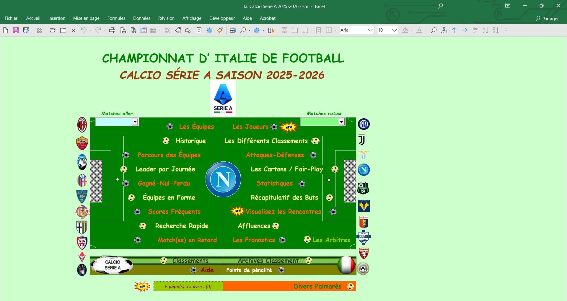 Description du fichier : Suivez le Championnat d'Italie ainsi que votre Équipe favorite, avec le fichier Ita. Calcio Serie A 2025-2026.Nouveautés de la saison 2025-2026 :