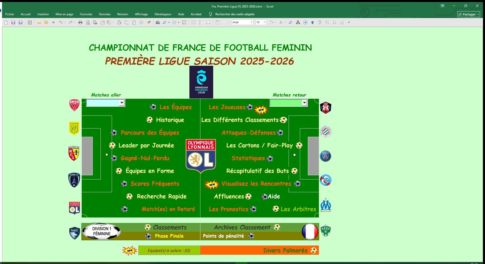 Description du fichier : Suivez le Championnat de France de Première Ligue Féminine ainsi que votre Équipe favorite, avec le fichier Fra. Première Ligue (F) 2025-2026.Nouveautés de la saison 2025-2026 :
